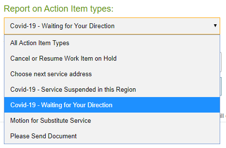 Many service requests were suspended to protect process servers and the public during Covid-19. The progress of each service request that was received or active during the temporary suspension of service has been paused by a new Action Item. We understand that each client and firm will make unique decisions about when to responsibly resume service. Your direction is required for service to continue.