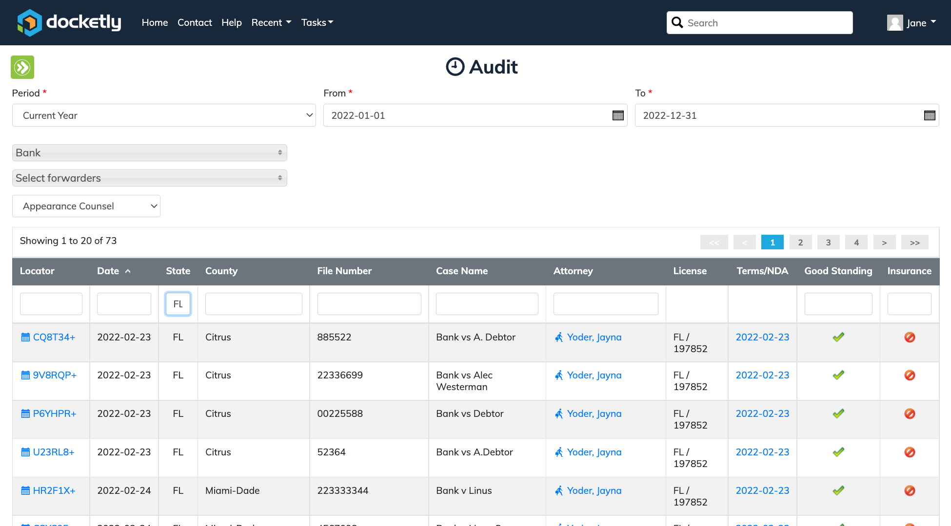 Yes, Docketly provides an umbrella policy for all appearance attorneys on its network. In addition, attorneys can upload their own malpractice insurance policy. You’re able to easily view an insurance “badge” on the attorney’s profile page indicating they carry their own policy. You can also use this added layer of insurance as a criterion during filtering.