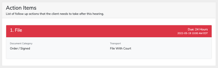 Stay on top of urgent court requests. For urgent action items from a hearing requiring your attention, appearance attorneys simply flag required communications in their report. An email alert goes out immediately upon the report submission. This eliminates the need for the appearance attorney to draft additional communications, increasing the speed at which you can receive and respond to urgent requests from the court, including requests with 24- or 48-hour deadlines.