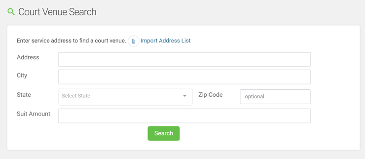 Court Venue Search is great tool if you’re doing a lot of small claims and collections work. In these cases, the address of the party being served has real impact on which venue is appropriate. However, the jurisdictions for these cases in select states are some of the trickiest to determine. We want to make determining venue easier for these cases. Court Venue Search does just that, aligning the service address with venues we've carefully mapped based on research with courts across the country.