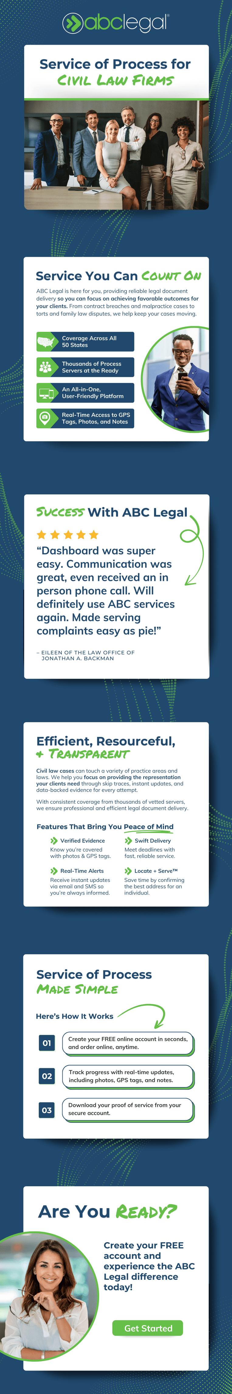 ABC Legal ensures seamless service of process for civil law cases, from subpoenas and notices to injunctions and citations. Find out how we can make legal document delivery the easiest part of your day.