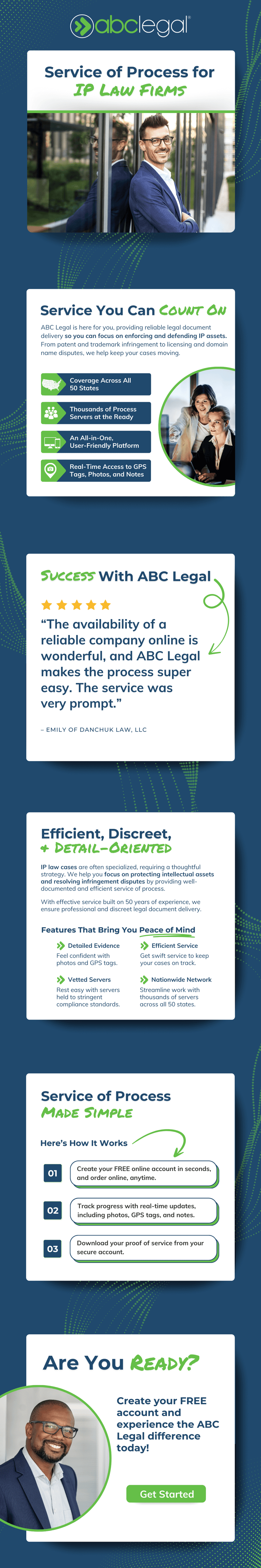 We've got your back for delivering infringement complaints, motions, subpoenas, counterclaims, notices of deposition, and more. Discover how ABC Legal supports IP law firmswith comprehensive features such as cost-efficient nationwide coverage, data-backed proof, and efficiency with every serve.