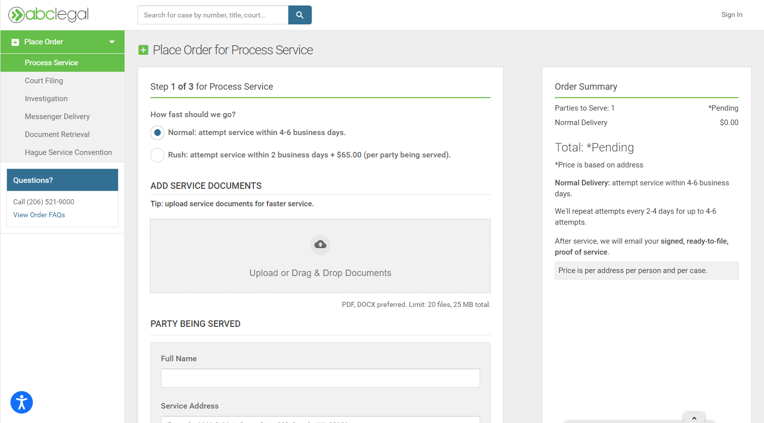 All you need are the documents you need delivered in a digital format, the name of the person you hope to serve, and the address you'd like us to go to. If there's anything special you want us to know or do for delivery, you can add additional notes for the process server, such as particular days to try or a description of the party to be served, during the place order process.