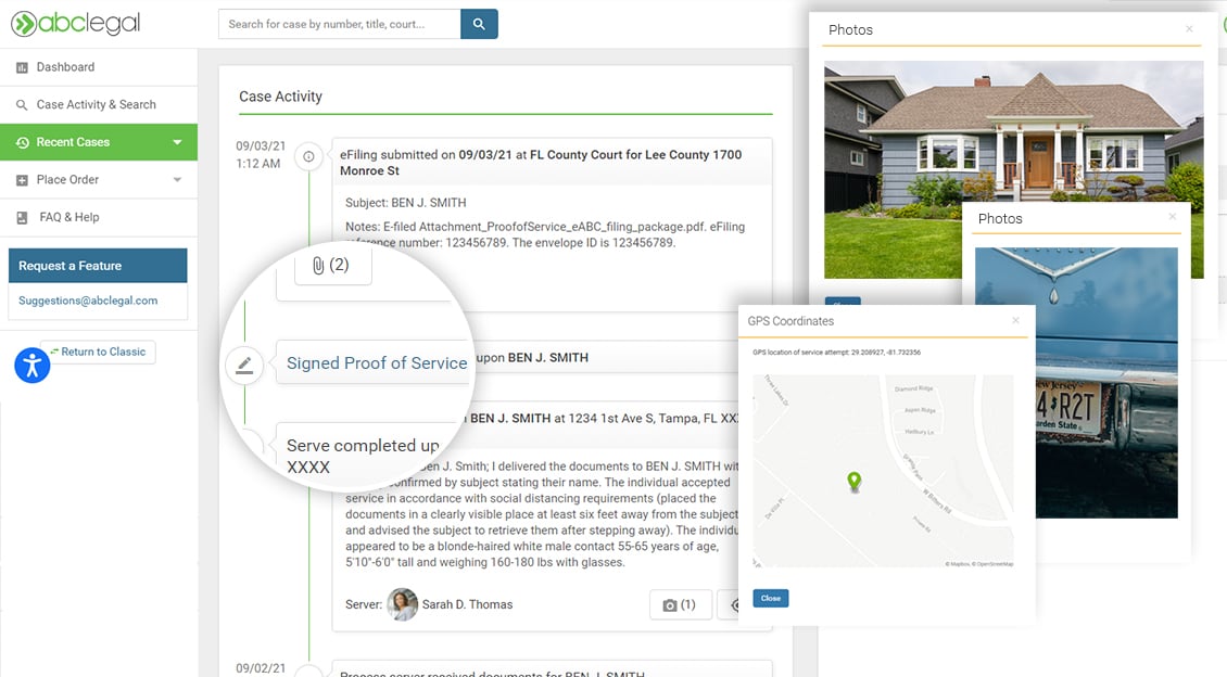We dispatch your job to the nearest qualified process server. As they drive around, knock on doors, and attempt service, ABC Mobile transmits live data and images to your dashboard.