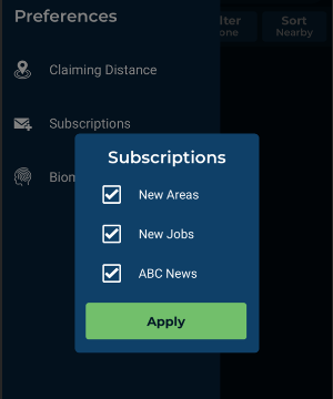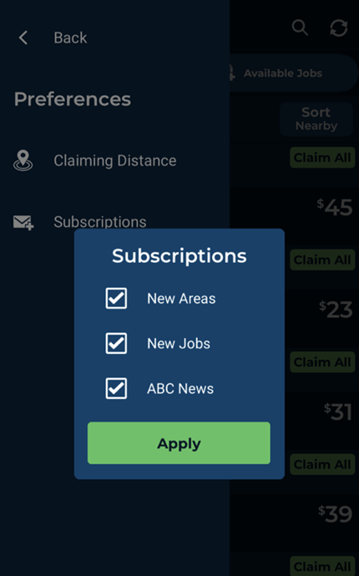 - Turn on Subscriptions: Get notified when new areas and new jobs are available near you by adjusting this setting in your subscriptions within the “Preferences” section in the side menu.