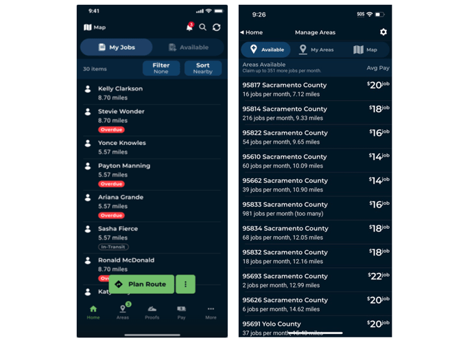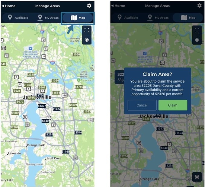 To view claimable areas that are available select "Areas" conveniently located in the bottom Navigation Bar. Click on "Available" to view all the areas that can be claimed. You can view areas in a list view. Each area will indicate the typical number of received jobs per month and an average of the offered rates for that zip code.
