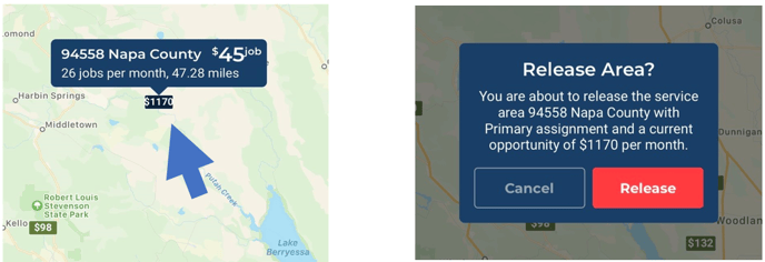 You can release any area that is currently in your “My Areas” List. To release an area, select the tab "My Areas" to show your list, select the area you no longer wish to receive work in, and press "Release."