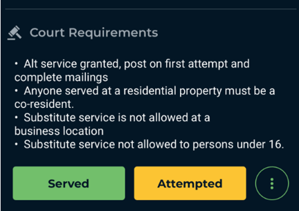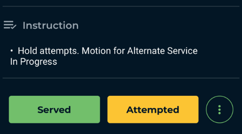 Once the process has begun, you will receive a notification in ABC Mobile that reads "Hold Attempts. Motion for Alternative Service" A special Proof of Non-Service will be dispatched to you that will require a signature. This is your testament to the truth of the attempts logged so far in that order.