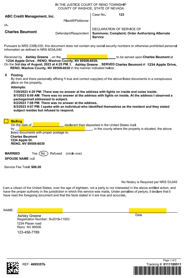 Diligence Requirements: For the alternative service order to be approved, Nevada courts want to see that you made diligent attempts to perform personal service. In general, that means: