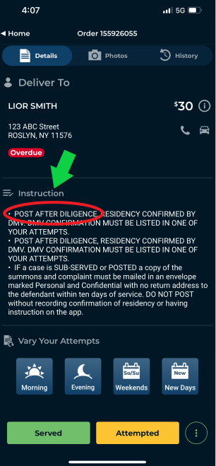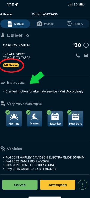 If a job is eligible for posting due to Alternate Service being granted, you will see a yellow tag stating, "Alt Service" following an instruction of "Granted motion for alternate service - Mail Accordingly".