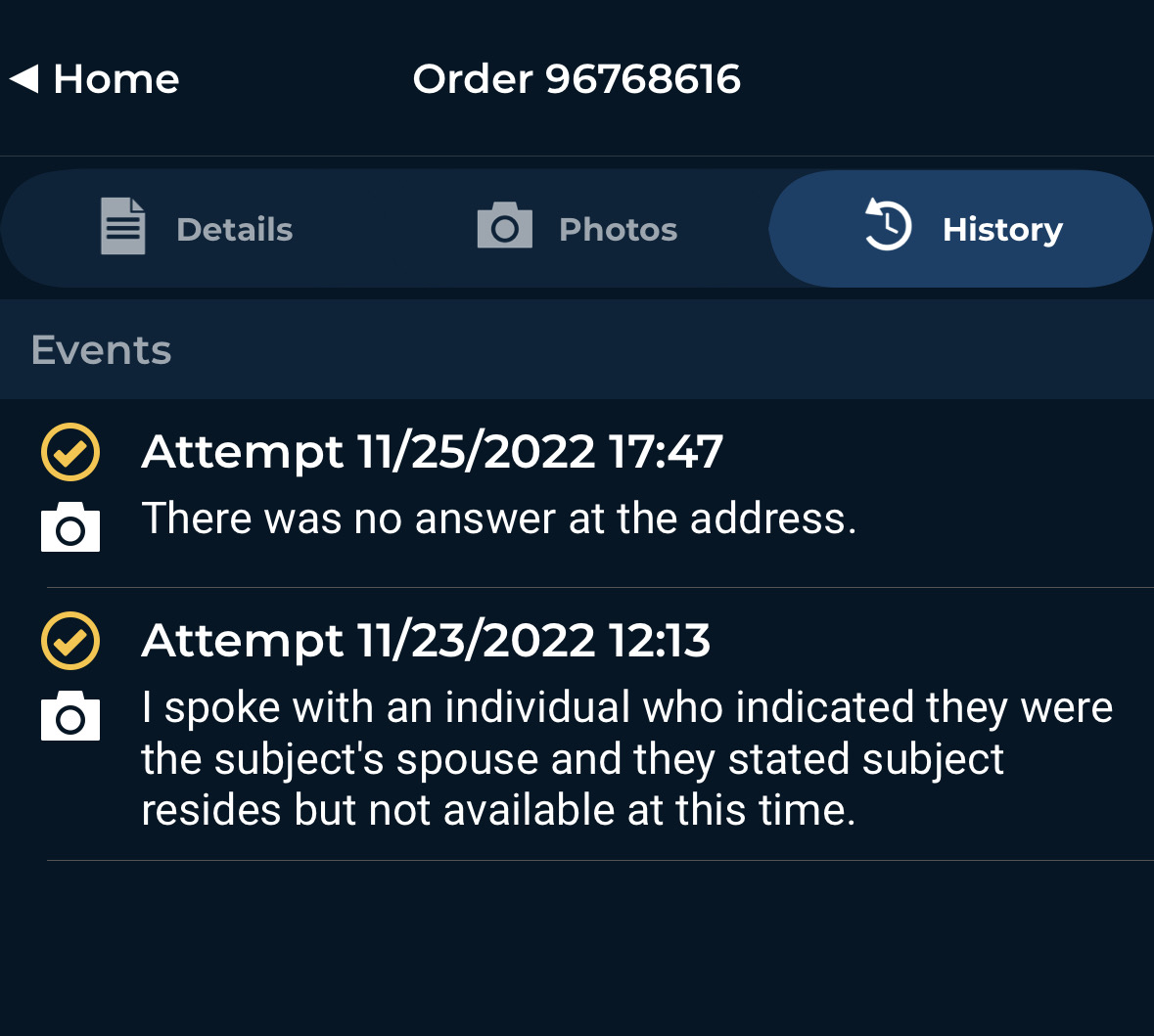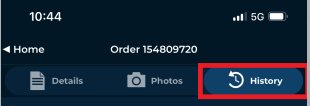 To confirm that your Attempt or Service was logged, go to the order details and click on “History.” If your submission is not visible, it was not recorded in ABC Mobile.