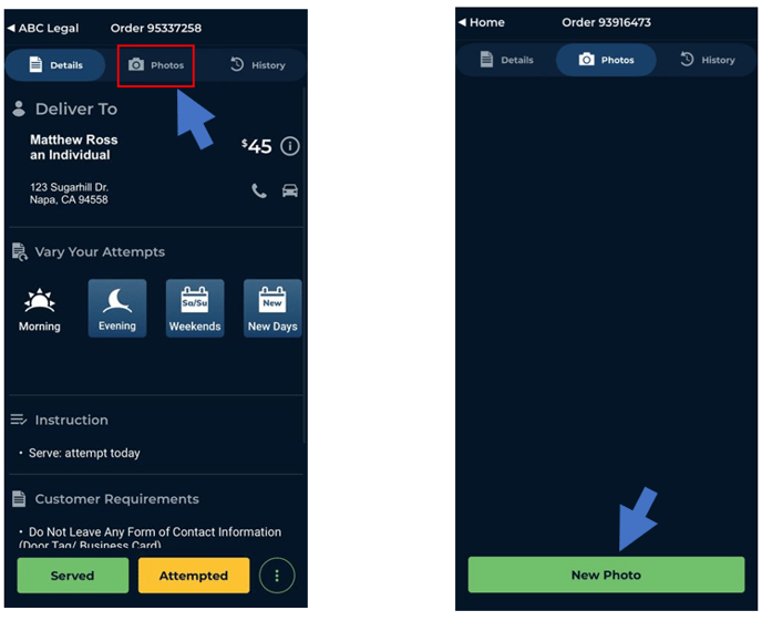 1- In the order details select “Photos” (only if taking photos prior to logging an attempt or service) otherwise click on "Served" or "Attempted" follow all prompts