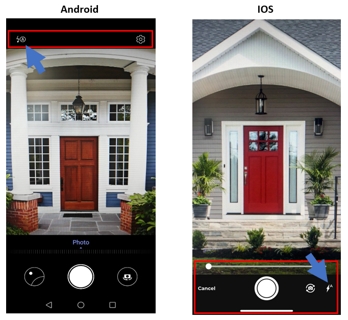 5- Default setting will be automatic flash, be sure to turn the flash off depending on the circumstances and your safety! Flash icon will be positioned differently depending on your device