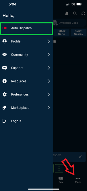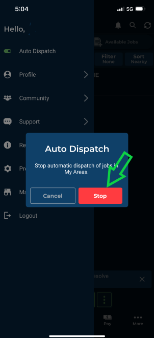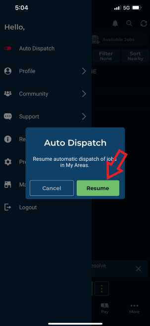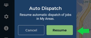 • Resuming Work: When ready to return, select Resume in Auto Dispatch to start receiving jobs in your assigned areas automatically.