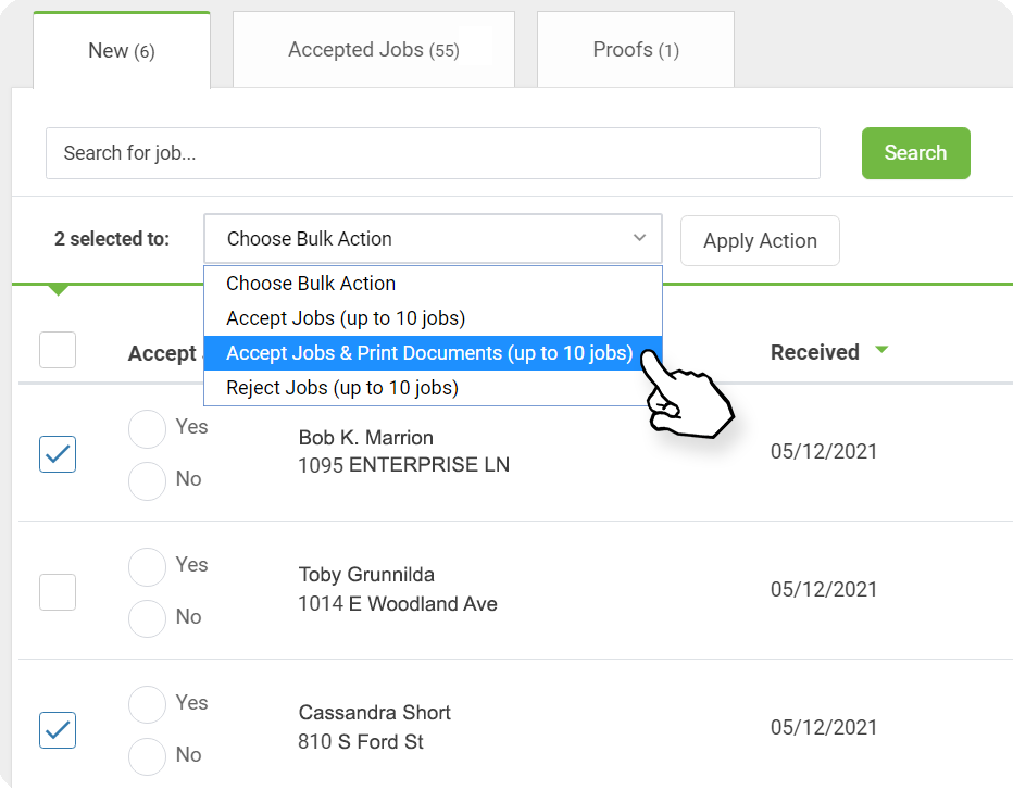 Once selecting one of those options, check up to 10 jobs you would like to accept or reject.  Lastly, select “Apply Action” to complete this task.