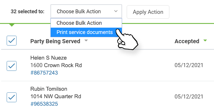 To print service documents, select “My Jobs” and then “Accepted Jobs.” You can select “Accepted” to sort your orders by oldest or most recently accepted. Where it says, “Choose Bulk Action,” change the action to “Print Service Documents” and check the jobs you would like to be printed. Selecting “Apply Action” will open up the service documents in a new tab in your browser for you to print.