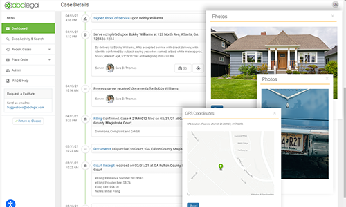 ABC Legal provides prompt, professional, and compliant service of process for every customer. You'll have a process server make multiple attempts at the address provided who will record GPS and photo data to validate service at every step. You get the details instantly in your account as progress is made. It's like going along for the ride. Whether you need a summons and complaint served for a tort claim or for any other civil lawsuit, we have you covered.