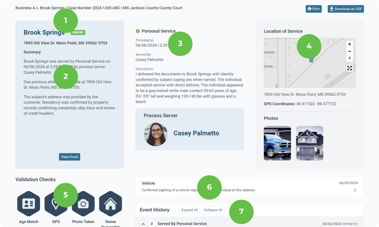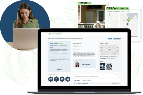 Follow the trail taken by the process server with EvidenceChain™. See every step, from validation checks and attempt notes to GPS coordinates and photos.