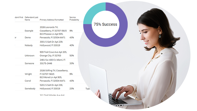 Check the facts before you start your filing. Upload your defendant data on our secure FTP. Get an endorsed address and court recommendation (for collections cases*) in less than a day, plus the probability of service at each address.