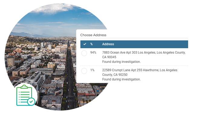 The stakes are higher on these. Our results show that there's another address where you'll have a significantly higher chance for service, but it's in another state. You'll get the new address, the venue and court information (for collections/small claims cases), and the probability score there to compare.