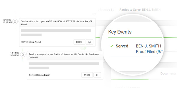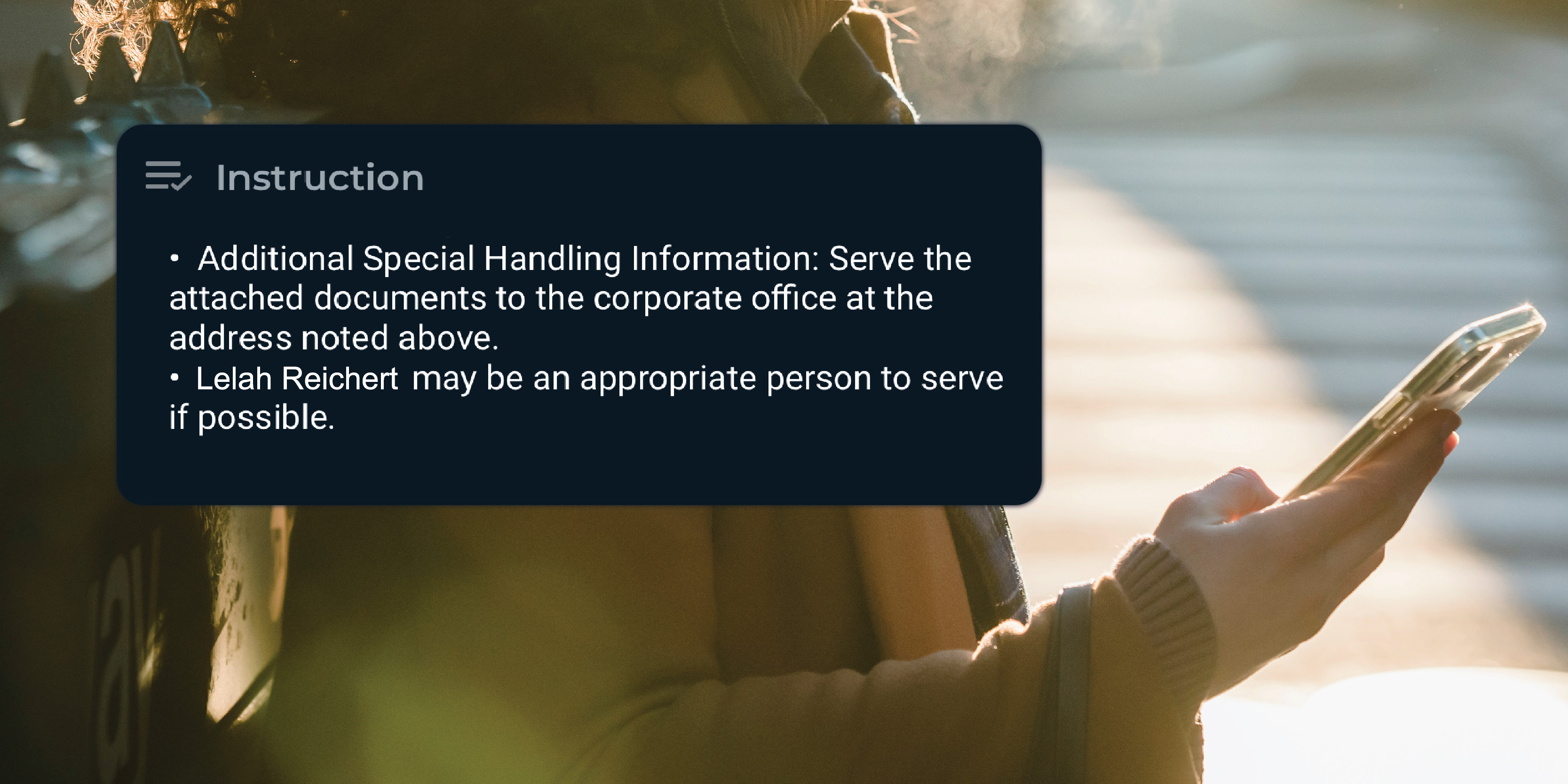 The app puts all relevant data at the process server’s fingertips, including information about the party being served, court diligence requirements, and special handling instructions.