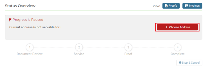 - After your order has been stopped you will need to either choose an address after clicking on the 'Choose Address' action item and selecting an address, or you will need to cancel your order and submit a new order with the correct address. The instructions for cancelling an order can be found here.