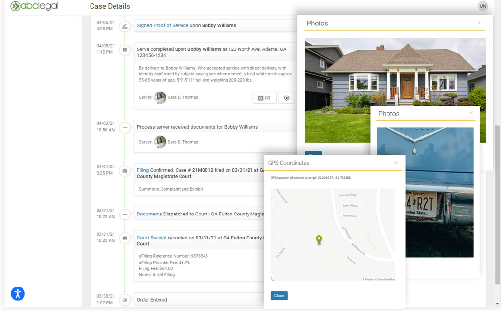 We dispatch to the best, local process server. As they drive around, knock on doors, take photos, and attempt service, ABC Mobile sends live data and images to your dashboard.