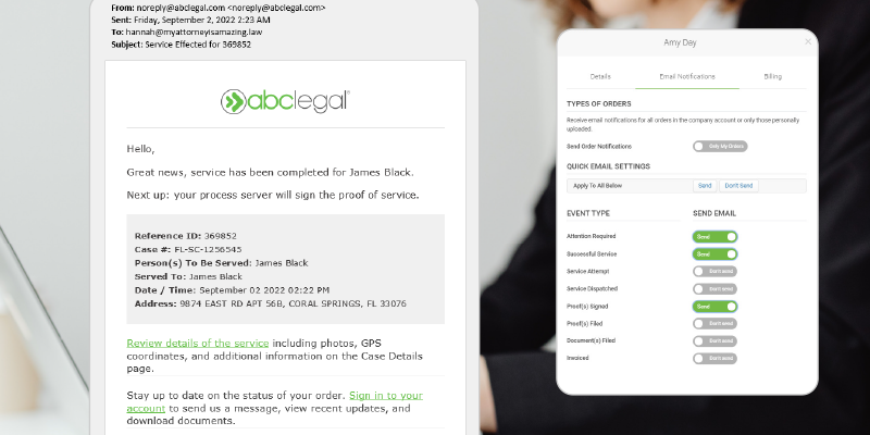 We could not be more pleased with ABC Legal! They're efficient and cost-effective and their client portal is so easy to navigate. On top of that, it's very easy to communicate with staff about orders. Within a week, we were able to get our defendants served and were kept in the loop throughout the whole process.